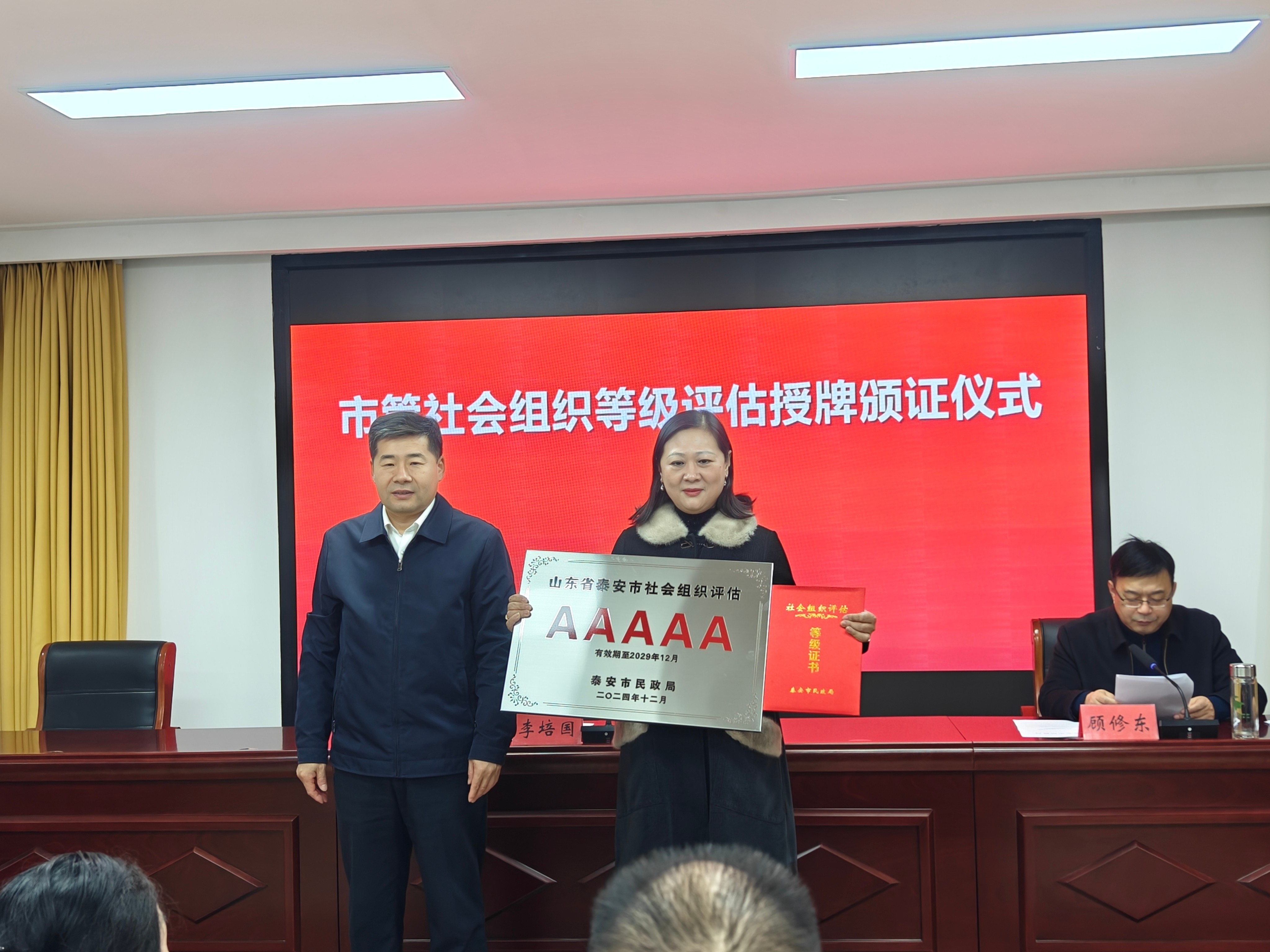 2025年1月17日上午,市民政局党组书记、市社会组织党委书记李培国为获得5A等级社会组织授牌,泰安市信用协会会长杨忠俊参加并领取了5A级社会组织等级牌匾及证书。